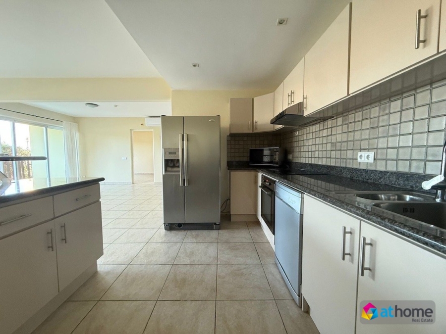 Het appartement is eigentijds afgewerkt en biedt een lichte, open indeling. De woonkamer sluit via schuifdeuren aan op een ruim, overdekt terras met uitzicht op het gemeenschappelijke zwembad en de tropische tuin. De moderne keuken is uitgerust met inbouwapparatuur, waaronder een oven, kookplaat en vaatwasser.