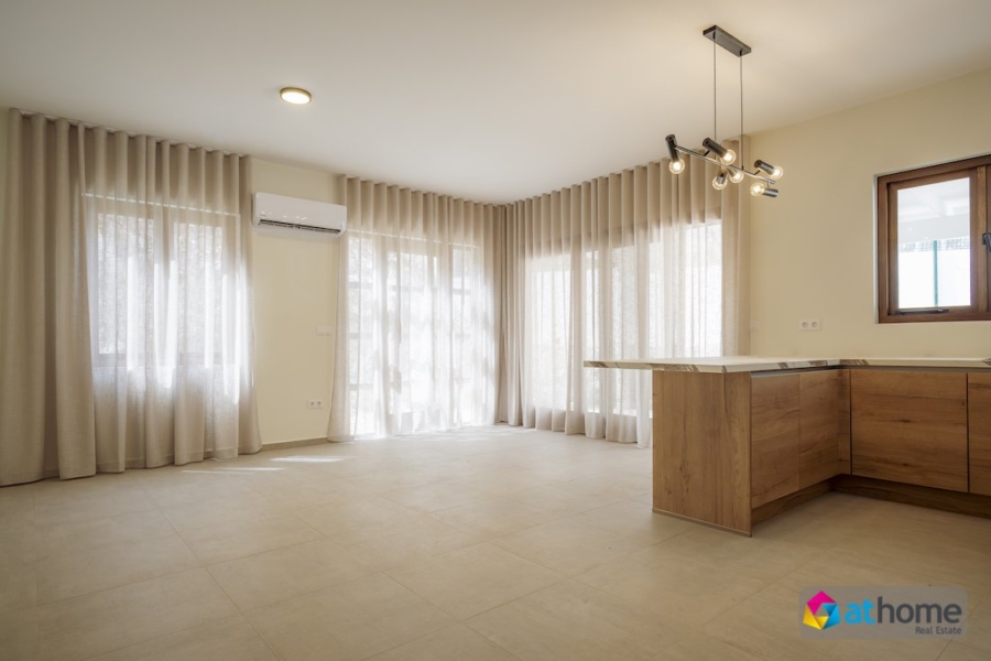 Het appartement heeft een eigentijdse afwerking en een fijne indeling met veel lichtinval. De keuken is voorzien van een marmerlook blad en inbouwapparatuur, zoals een oven, vaatwasser en elektrische kookplaat. Zowel de woonkamer als de twee slaapkamers beschikken over airconditioning. Via de schuifdeuren bereik je de overdekte porch van ongeveer 25 m².