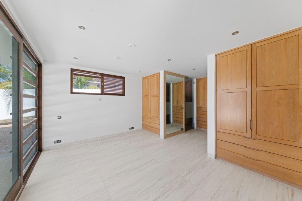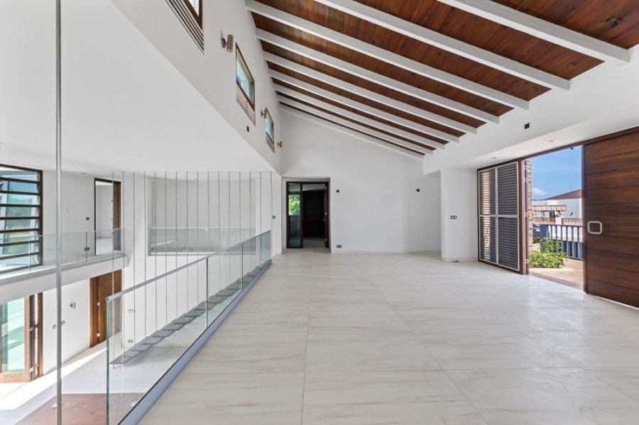This stunning detached villa in the exclusive Blue Bay Golf & Beach Resort is situated on a generous 928 m² plot, offering complete privacy and a tropical ambiance. The residence spans two floors and is designed for comfortable and stylish living.With 3 spacious bedrooms and 3 luxurious bathrooms, including one with a relaxing jacuzzi, you can enjoy ultimate comfort. Two of the upstairs bedrooms feature large walk-in closets. All built-in cabinets in the bathrooms and walk-in closets are custom-made, ensuring a flawless finish and optimal storage space. The bathrooms are also equipped with spacious walk-in showers and modern toilets.The very large utility room, with plenty of built-in cabinets, provides practical storage and additional functionality.Hardwood folding doors seamlessly open to the garden with a beautiful L-shaped pool and a private jacuzzi, creating a perfect blend of indoor and outdoor living.A multifunctional fitness/dance studio with its own bathroom offers extra space for sports, hobbies, or relaxation. Upstairs, there is a large open mezzanine with an atmospheric gallery and double wooden staircases on either side, providing ample natural light and elegant architectural charm.From the living room on the first floor, you enjoy panoramic views of the stunning golf course, enhancing the sense of peace and space.In addition to a garage, there is also a carport, providing extra parking convenience.The villa is in a prime location within the resort, close to the white sand beach and golf course, with all luxury amenities within easy reach.Key Features: