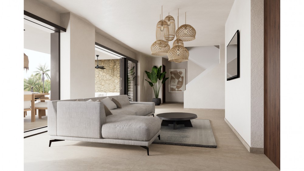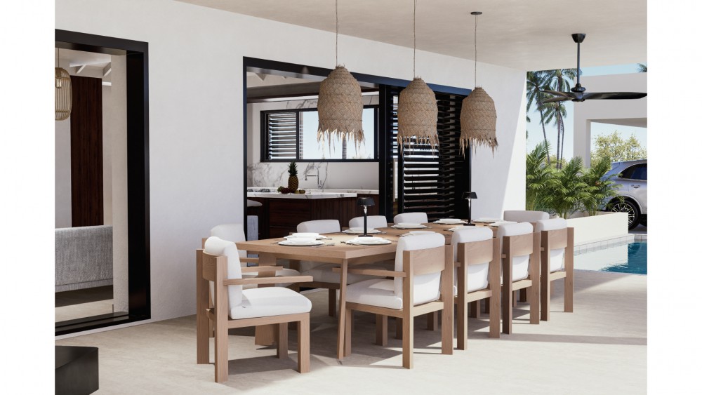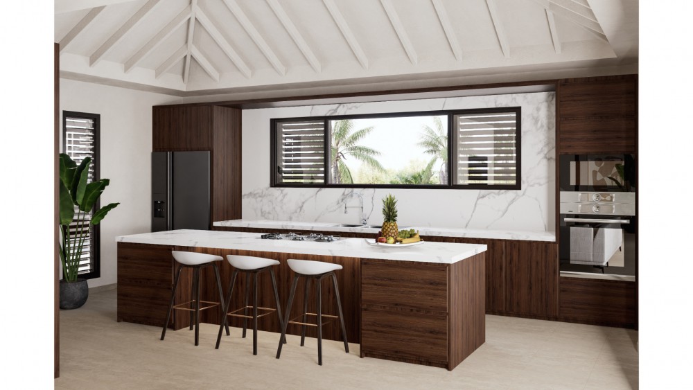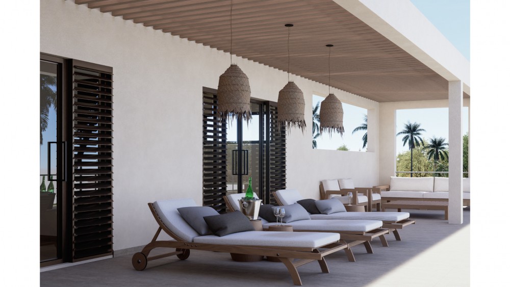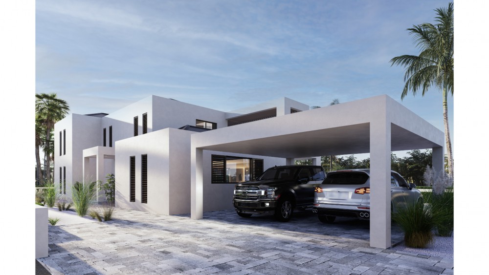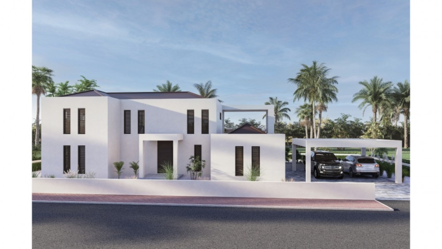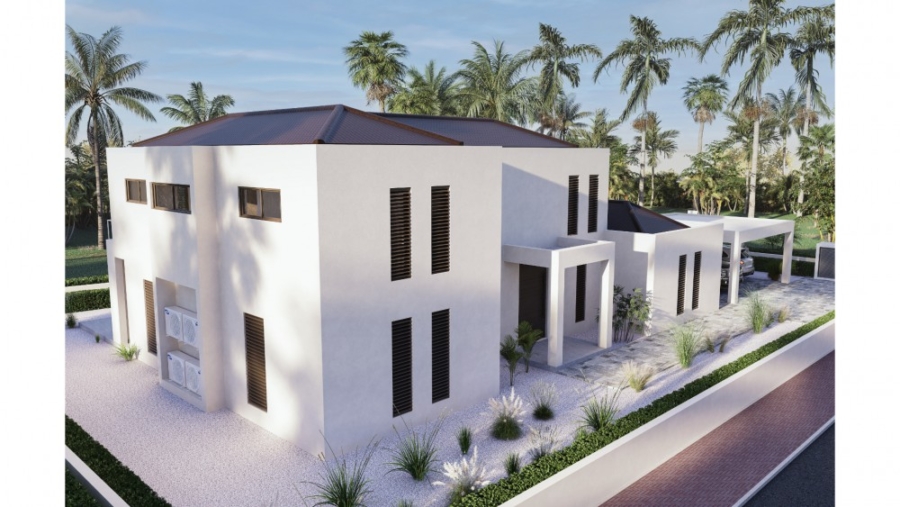 Through the impressive entrance you enter the living room with an adjacent spacious open kitchen. The kitchen has been carefully designed and equipped with all modern conveniences, including a spacious cooking island, an electric hob, a dishwasher, a combination oven and a fridge/freezer combination.The living room extends into a large terrace (130m2), of which 60m2 is covered. The sliding doors can be completely retracted into the walls, making the inside feel like outside.The villa is built well on the wind, which ensures a cooling breeze, the spacious porch offers plenty of shade where you can relax and offers enough space for a lounge set and dining table. To the left of the terrace is a lovely swimming pool with lounge deck to enjoy the necessary cooling and the Caribbean outdoor life.The master bedroom is located in the left wing of the house, which has been designed with an eye for detail and comfort. From here you also have direct access to the porch with an amazing view. This master bedroom has a spacious walk-in closet that offers sufficient storage space for all your clothing and accessories and a spacious bathroom equipped with a double sink, a walk-in shower and a toilet.Downstairs there is a laundry room/utility room and a separate guest toilet.The stairs in the hall lead you to the upper floor where on the right you will find another very spacious bedroom with an adjacent spacious walk-in closet with private bathroom. The bathroom has a double sink, a walk-in shower and a toilet.The two other spacious bedrooms share an equally tasteful bathroom, again with a double sink, a walk-in shower and a toilet. This offers residents of this home all comfort and luxury.Through the hall you have access to the amazing second roof terrace with pergola with beautiful views and which offers plenty of space for sun beds and a complete lounge set.Next to the house there is enough space for a beautiful carport that is suitable for parking two cars, so that your vehicles are sheltered. This is optional and can be built in consultation.In short, a luxuriously finished, modern and maintenance-friendly villa where the design takes into account the possibility of holiday rental. A very interesting investment.