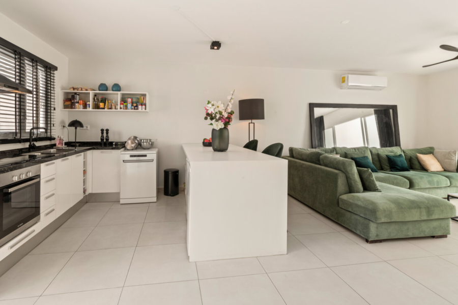 Als u binnenkomt, wordt u verwelkomt door een moderne keuken, compleet met chef's table. De open indeling met strakke, witte tegelvloeren, sluit naadloos aan op een gedeeltelijk overdekt buitenterras. Grote glazen schuifdeuren nodigen uit tot natuurlijke lichtinval en creëren een harmonieuze flow tussen binnen- en buitenruimten.