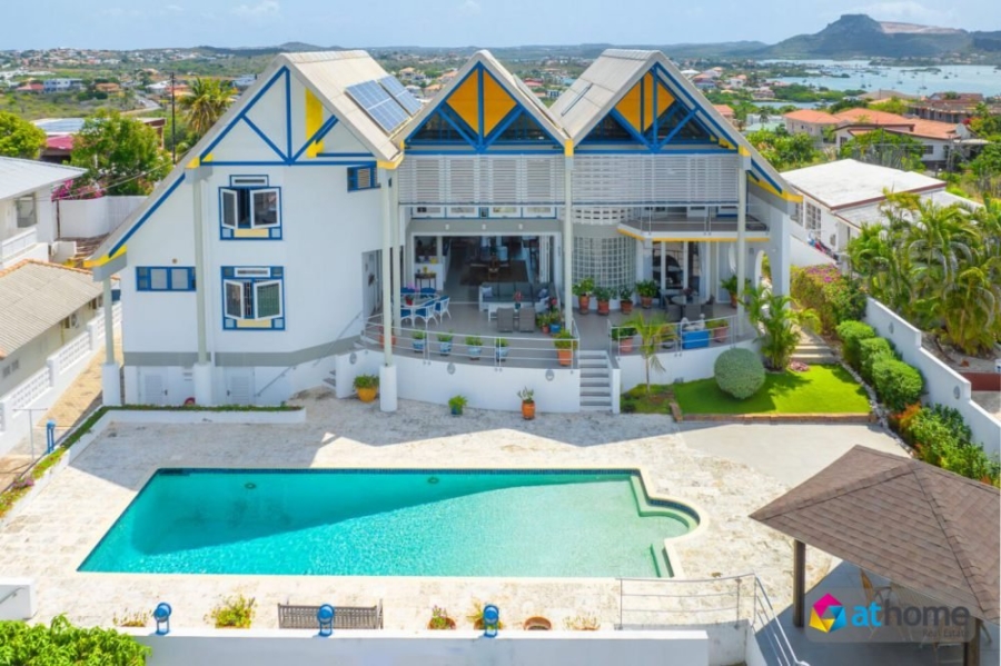 Een ware lust voor het oog! Bij het betreden van het terrein valt direct de uitnodigende voortuin op, met imposante ramen en stijlvolle balken die het karakter van de gevel versterken. De statige entree leidt naar de majestueuze, tweelaagse woonkamer, waar grote ramen zorgen voor een verfrissende Caribische bries en een spectaculair uitzicht. De aangrenzende, moderne keuken is volledig uitgerust en loopt naadloos over in de eetkamer.