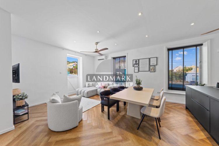 De woonruimte ademt licht en elegantie. Grote ramen met originele vensters, monumentale Dutch doors en moderne glazen deuren vormen echte eyecatchers. De woonkamer loopt over in een leefkeuken en profiteert van 3,10 meter hoge plafonds, strak wit gestucte muren en stijlvolle spotverlichting in hotelstijl. Ventilatoren en airconditioning, bedienbaar via afstandsbediening of app, zorgen voor optimaal comfort.